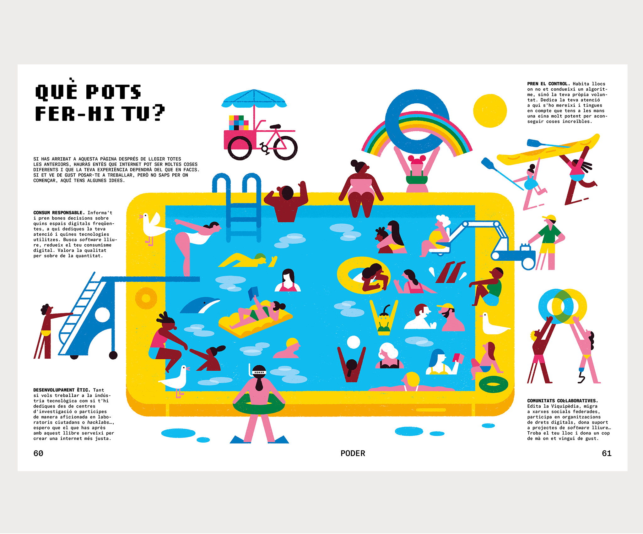 Aquest llibre no t’ensenyarà a utilitzar una aplicació ni a programar un lloc web —per a això ja hi ha molts tutorials—, sinó que t’explicarà per què internet és com és, la lògica de com funciona i algunes eines que poden portar-nos a vides digitals menys tòxiques i més respectuoses amb les persones i el medi ambient.